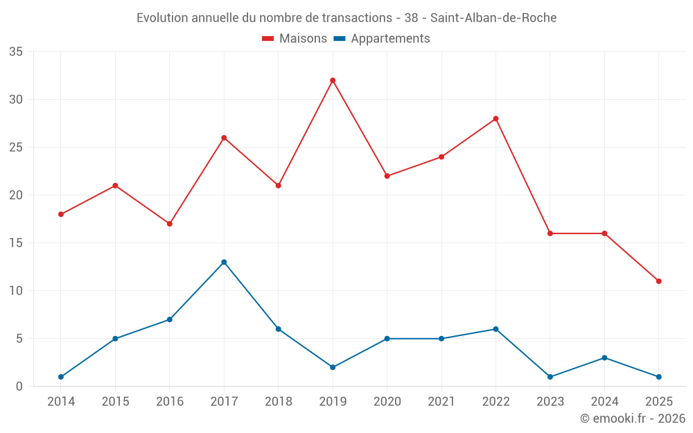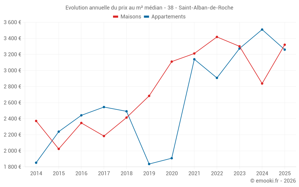 Le prix médian sur les 18 transactions de maisons des 12 derniers mois dans la commune de Saint-Alban-de-Roche était de 3 273 € par mètre carré pour une valeur foncière médiane de 312 250 €. Sur cette période 60% des transactions se sont situées entre 2 478 et 3 699 € par mètre carré (du 2ème au 8ème déciles).