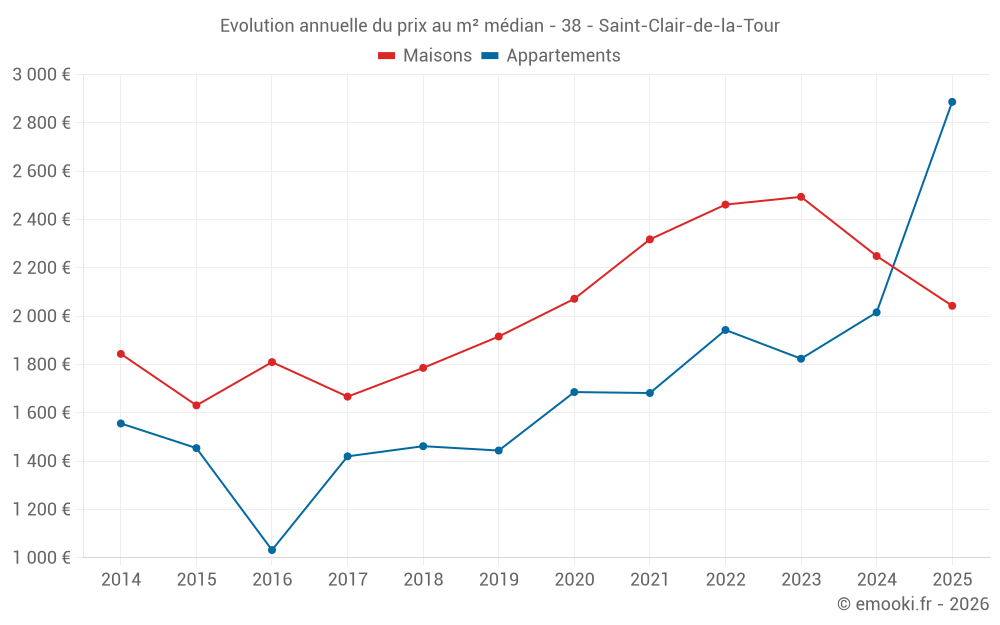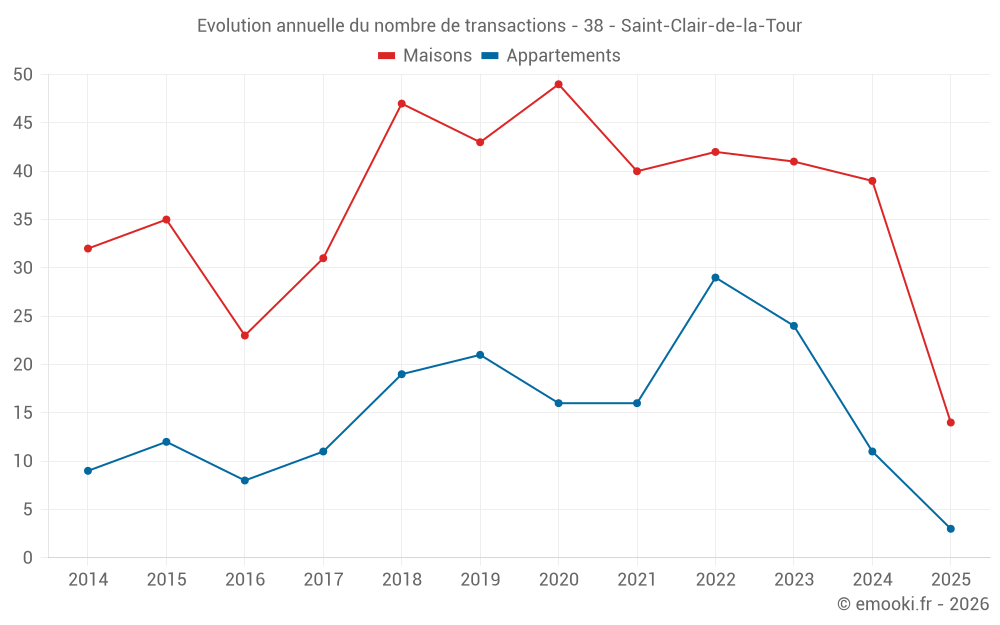 Le prix médian sur les 38 transactions de maisons des 12 derniers mois dans la commune de Saint-Clair-de-la-Tour était de 2 239 € par mètre carré pour une valeur foncière médiane de 192 750 €. Sur cette période 60% des transactions se sont situées entre 1 512 et 2 649 € par mètre carré (du 2ème au 8ème déciles).
