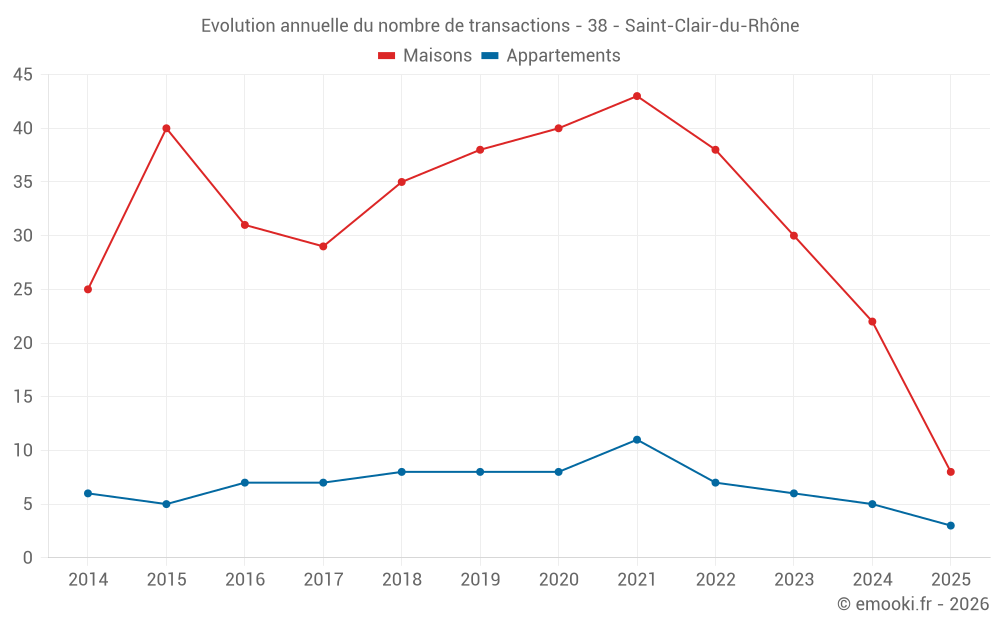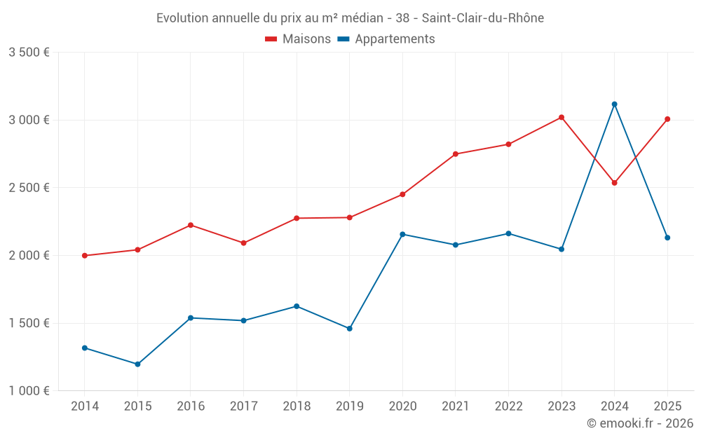 Le prix médian sur les 22 transactions de maisons des 12 derniers mois dans la commune de Saint-Clair-du-Rhône était de 2 770 € par mètre carré pour une valeur foncière médiane de 287 500 €. Sur cette période 60% des transactions se sont situées entre 2 049 et 3 579 € par mètre carré (du 2ème au 8ème déciles).