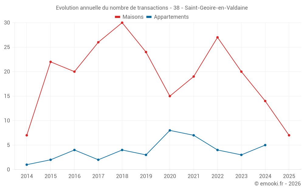 Le prix médian sur les 28 transactions de maisons des 24 derniers mois dans la commune de Saint-Geoire-en-Valdaine était de 2 373 € par mètre carré pour une valeur foncière médiane de 194 000 €. Sur cette période 60% des transactions se sont situées entre 1 304 et 2 926 € par mètre carré (du 2ème au 8ème déciles).