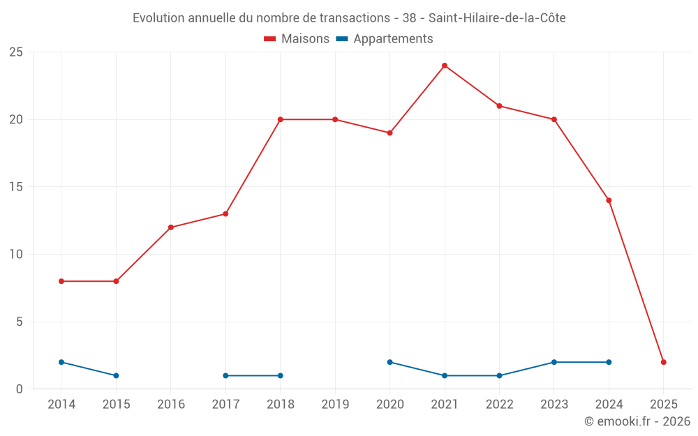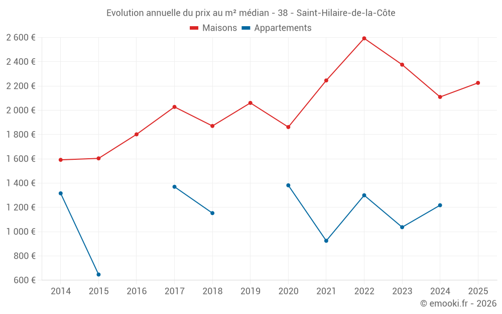 Le prix médian sur les 29 transactions de maisons des 24 derniers mois dans la commune de Saint-Hilaire-de-la-Côte était de 2 154 € par mètre carré pour une valeur foncière médiane de 238 400 €. Sur cette période 60% des transactions se sont situées entre 1 869 et 2 665 € par mètre carré (du 2ème au 8ème déciles).
