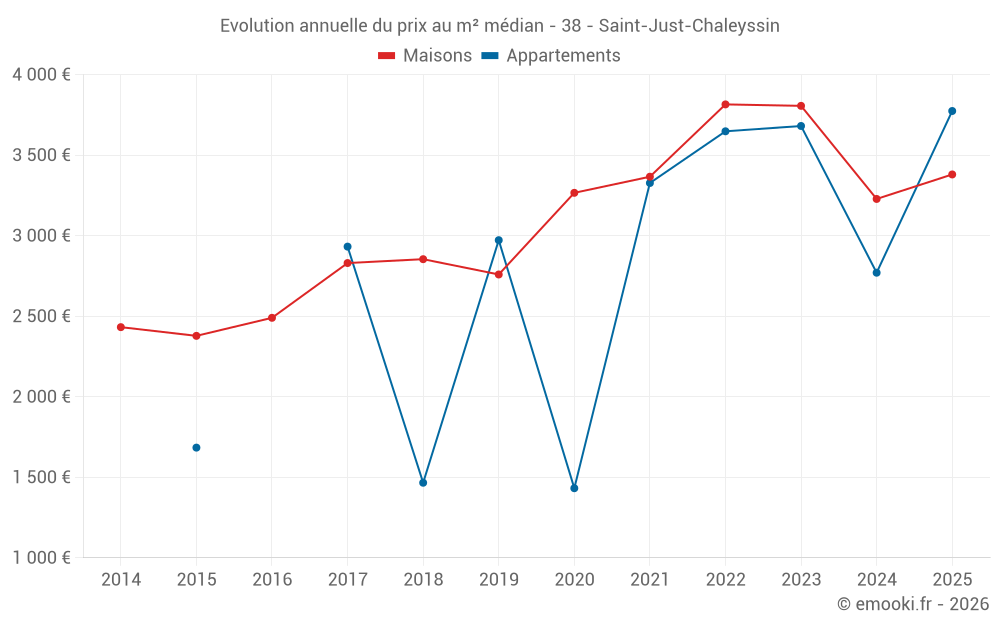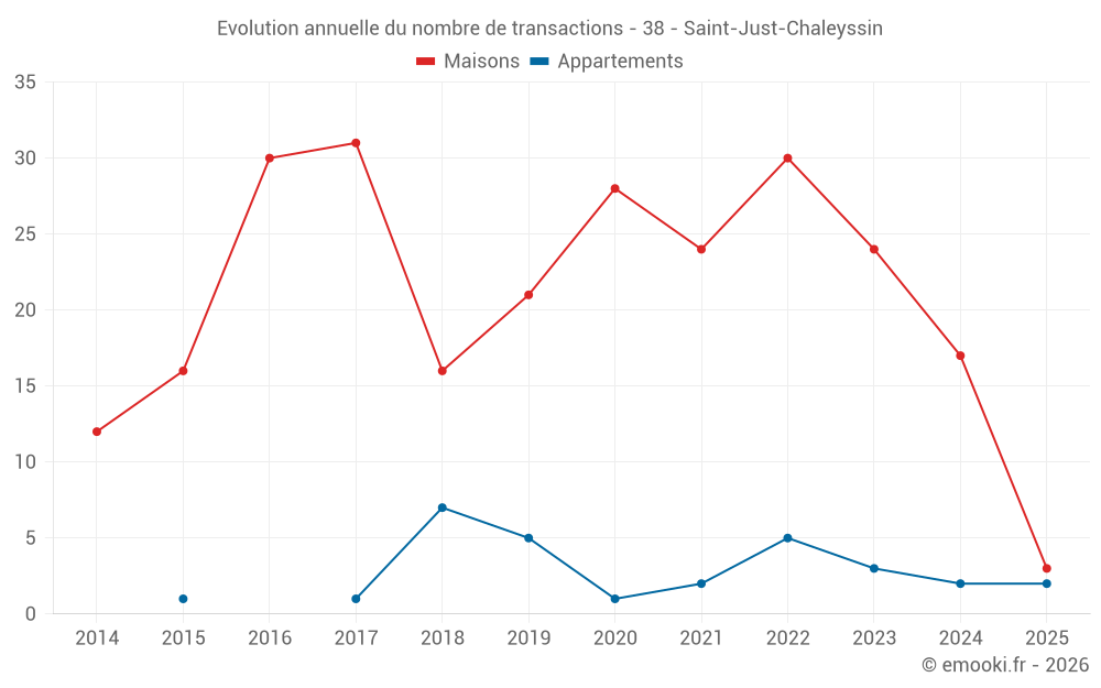 Le prix médian sur les 31 transactions de maisons des 24 derniers mois dans la commune de Saint-Just-Chaleyssin était de 3 380 € par mètre carré pour une valeur foncière médiane de 356 000 €. Sur cette période 60% des transactions se sont situées entre 2 959 et 3 870 € par mètre carré (du 2ème au 8ème déciles).