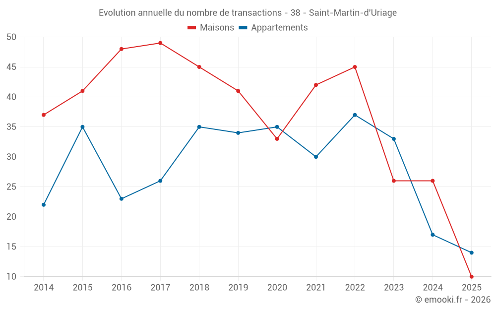 Le prix médian sur les 27 transactions de maisons des 12 derniers mois dans la commune de Saint-Martin-d'Uriage était de 4 058 € par mètre carré pour une valeur foncière médiane de 450 000 €. Sur cette période 60% des transactions se sont situées entre 3 114 et 4 464 € par mètre carré (du 2ème au 8ème déciles).
