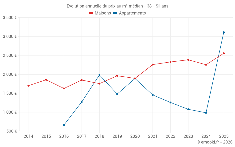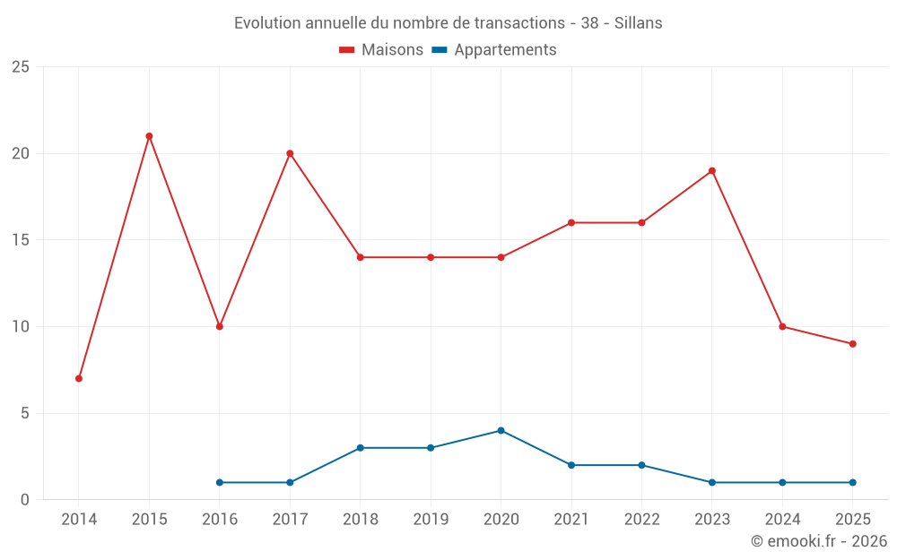 Le prix médian sur les 17 transactions de maisons des 12 derniers mois dans la commune de Sillans était de 2 358 € par mètre carré pour une valeur foncière médiane de 225 000 €. Sur cette période 60% des transactions se sont situées entre 1 886 et 2 801 € par mètre carré (du 2ème au 8ème déciles).