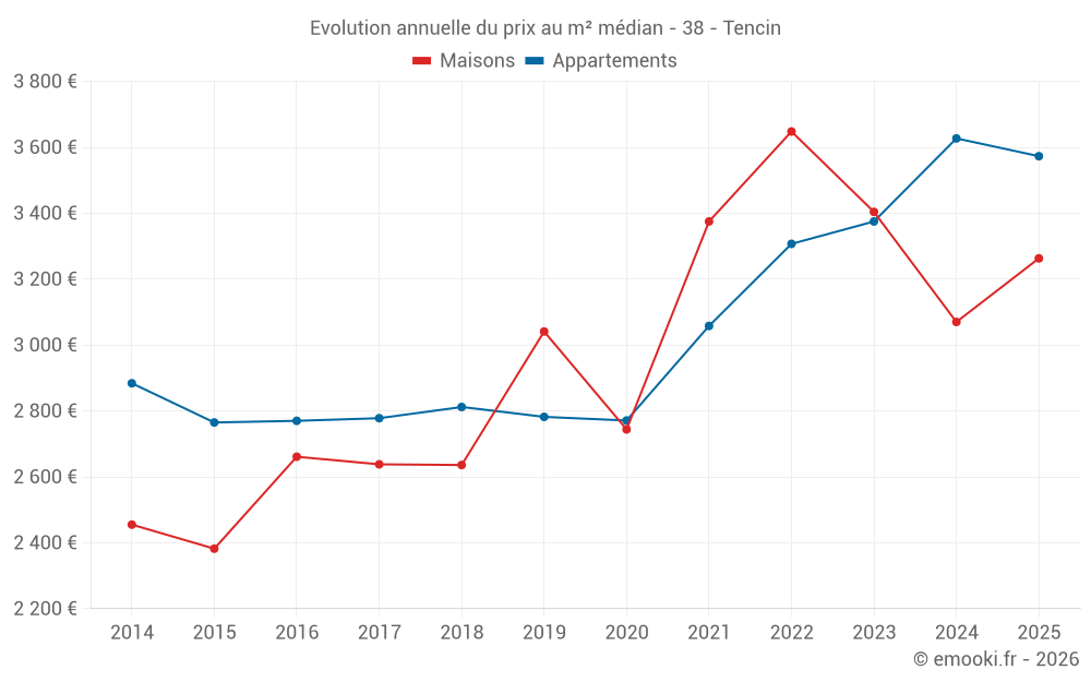 Le prix médian sur les 25 transactions de maisons des 24 derniers mois dans la commune de Tencin était de 3 263 € par mètre carré pour une valeur foncière médiane de 283 500 €. Sur cette période 60% des transactions se sont situées entre 1 918 et 3 716 € par mètre carré (du 2ème au 8ème déciles).