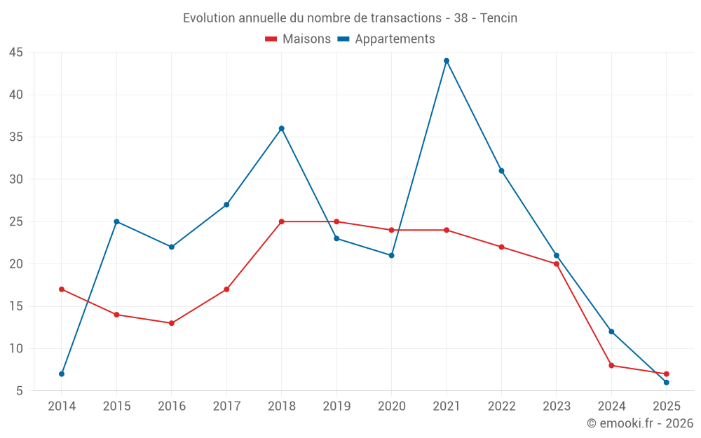 Le prix médian sur les 29 transactions d'appartements des 24 derniers mois dans la commune de Tencin était de 3 468 € par mètre carré pour une valeur foncière médiane de 232 000 €. Sur cette période 60% des transactions se sont situées entre 3 215 et 3 729 € par mètre carré (du 2ème au 8ème déciles).