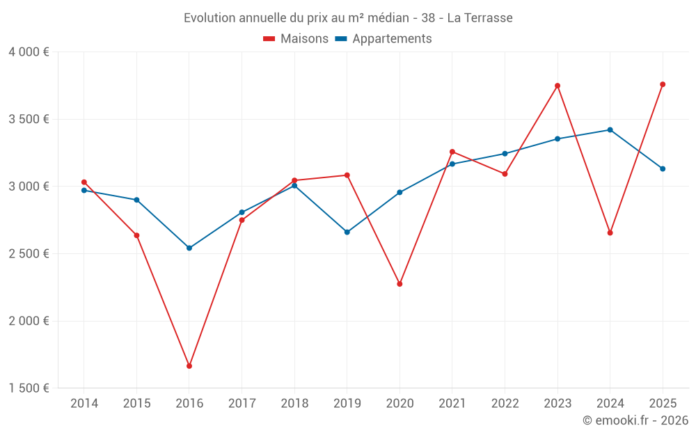 Le prix médian sur les 36 transactions d'appartements des 24 derniers mois dans la commune de la Terrasse était de 3 346 € par mètre carré pour une valeur foncière médiane de 191 525 €. Sur cette période 60% des transactions se sont situées entre 2 652 et 3 780 € par mètre carré (du 2ème au 8ème déciles).