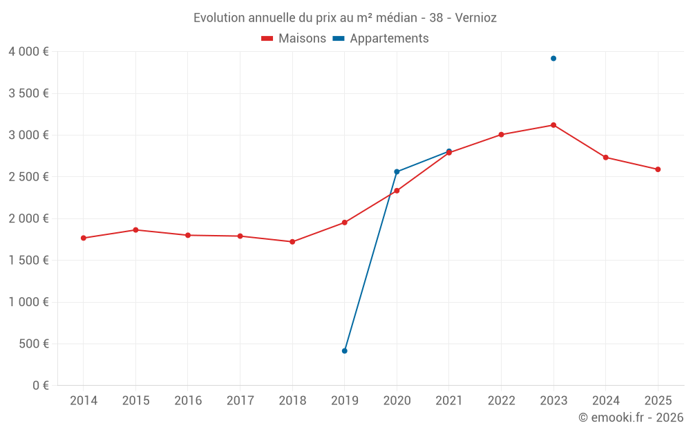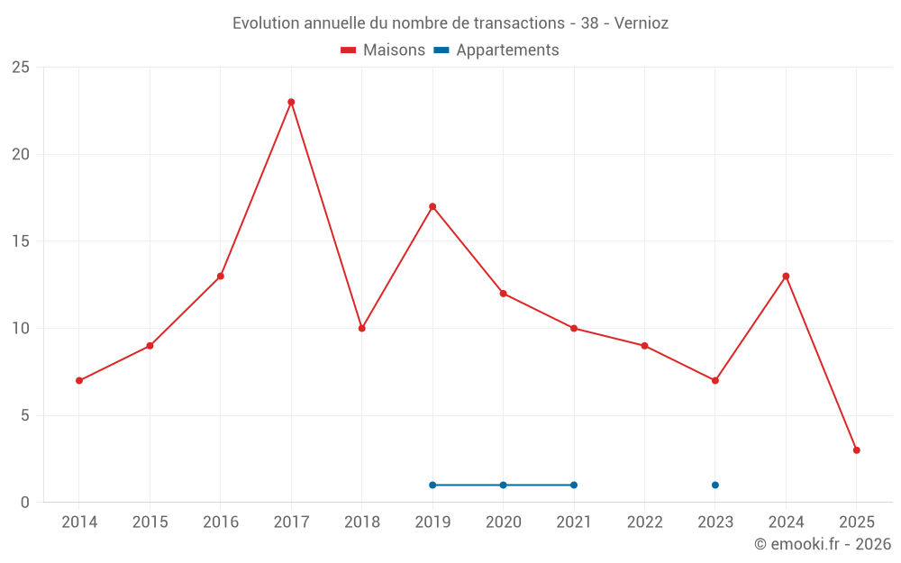 Le prix médian sur les 21 transactions de maisons des 24 derniers mois dans la commune de Vernioz était de 2 780 € par mètre carré pour une valeur foncière médiane de 350 000 €. Sur cette période 60% des transactions se sont situées entre 2 349 et 3 393 € par mètre carré (du 2ème au 8ème déciles).