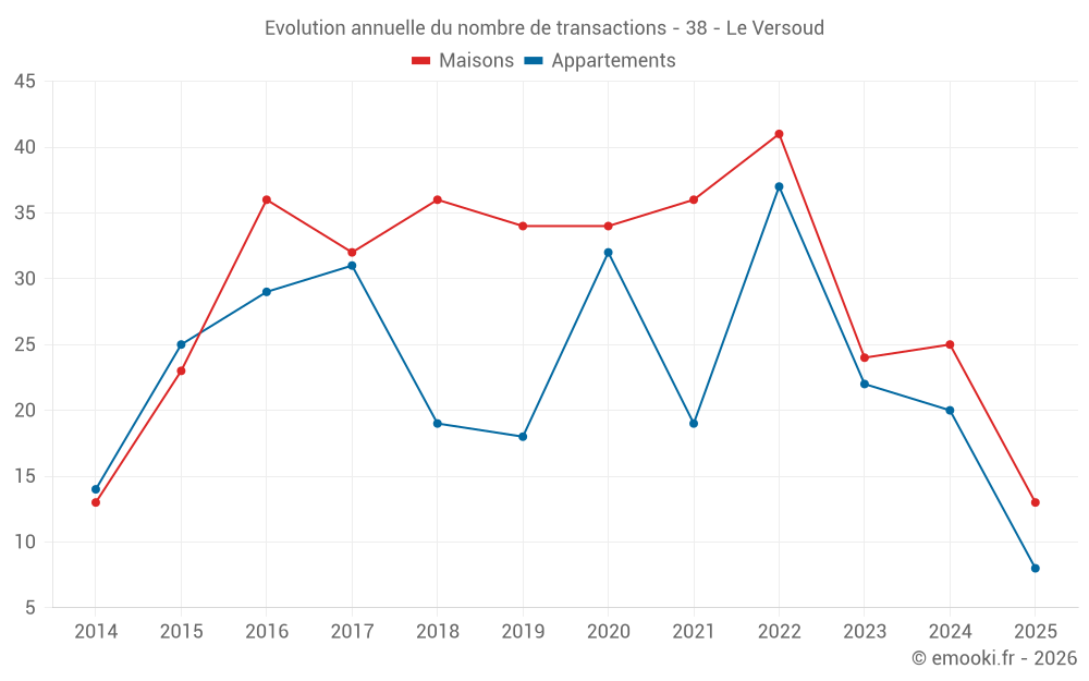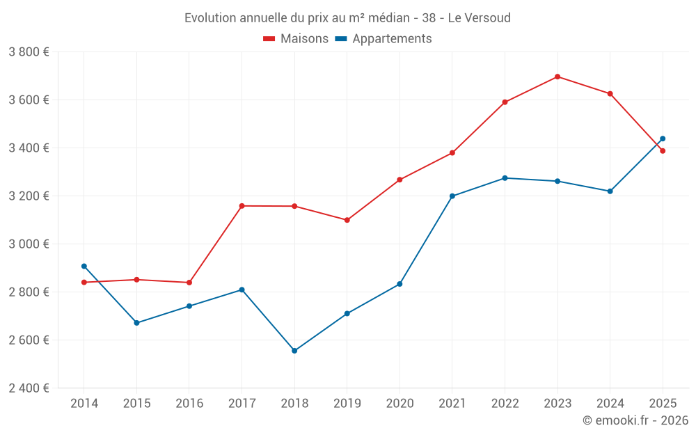 Le prix médian sur les 17 transactions d'appartements des 12 derniers mois dans la commune du Versoud était de 3 357 € par mètre carré pour une valeur foncière médiane de 219 000 €. Sur cette période 60% des transactions se sont situées entre 2 929 et 3 736 € par mètre carré (du 2ème au 8ème déciles).