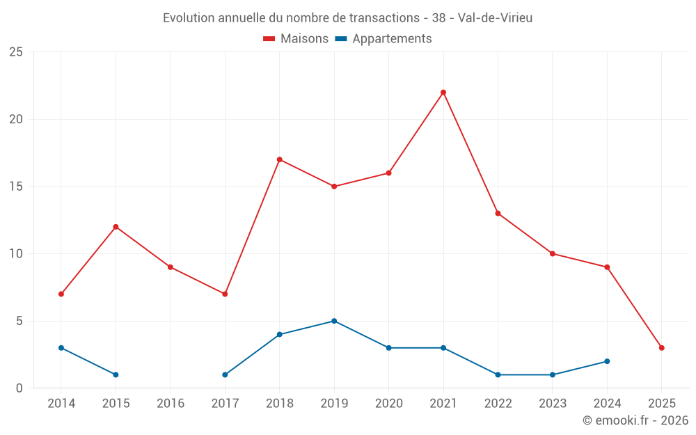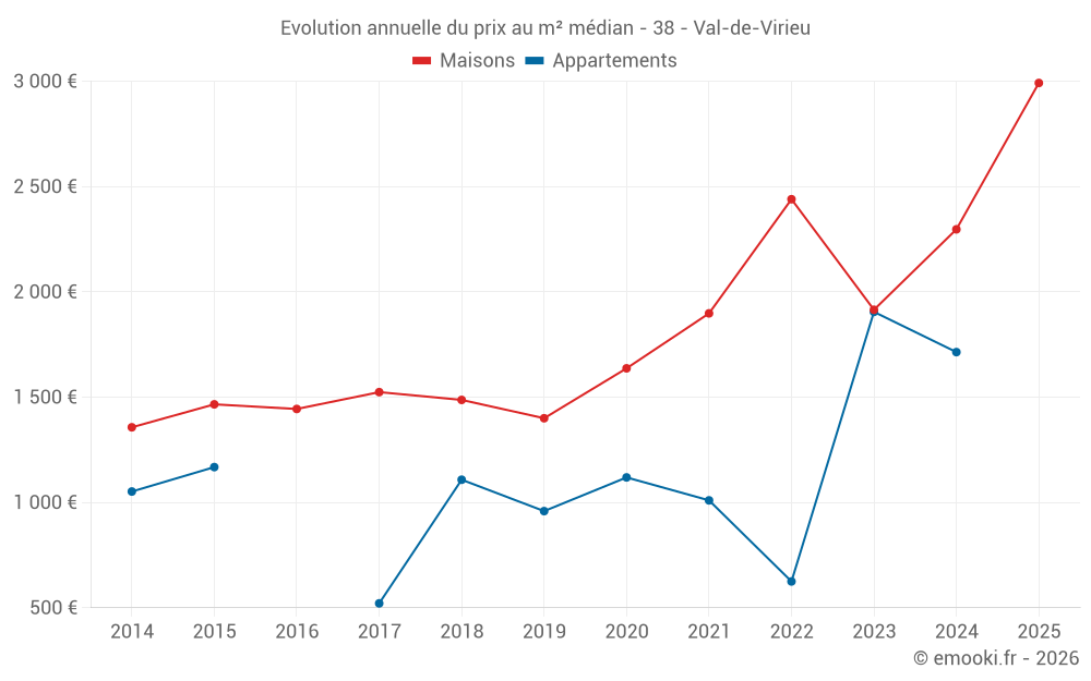Le prix médian sur les 18 transactions de maisons des 24 derniers mois dans la commune de Val-de-Virieu était de 2 436 € par mètre carré pour une valeur foncière médiane de 241 600 €. Sur cette période 60% des transactions se sont situées entre 1 720 et 3 027 € par mètre carré (du 2ème au 8ème déciles).