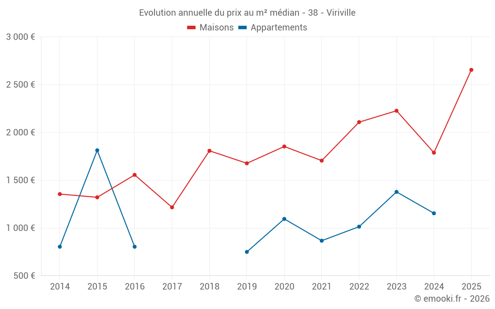 Le prix médian sur les 23 transactions de maisons des 24 derniers mois dans la commune de Viriville était de 1 859 € par mètre carré pour une valeur foncière médiane de 195 000 €. Sur cette période 60% des transactions se sont situées entre 1 550 et 2 628 € par mètre carré (du 2ème au 8ème déciles).
