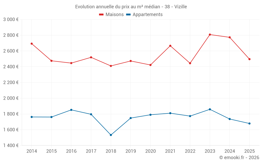 Le prix médian sur les 31 transactions de maisons des 12 derniers mois dans la commune de Vizille était de 2 605 € par mètre carré pour une valeur foncière médiane de 243 000 €. Sur cette période 60% des transactions se sont situées entre 1 875 et 3 086 € par mètre carré (du 2ème au 8ème déciles).