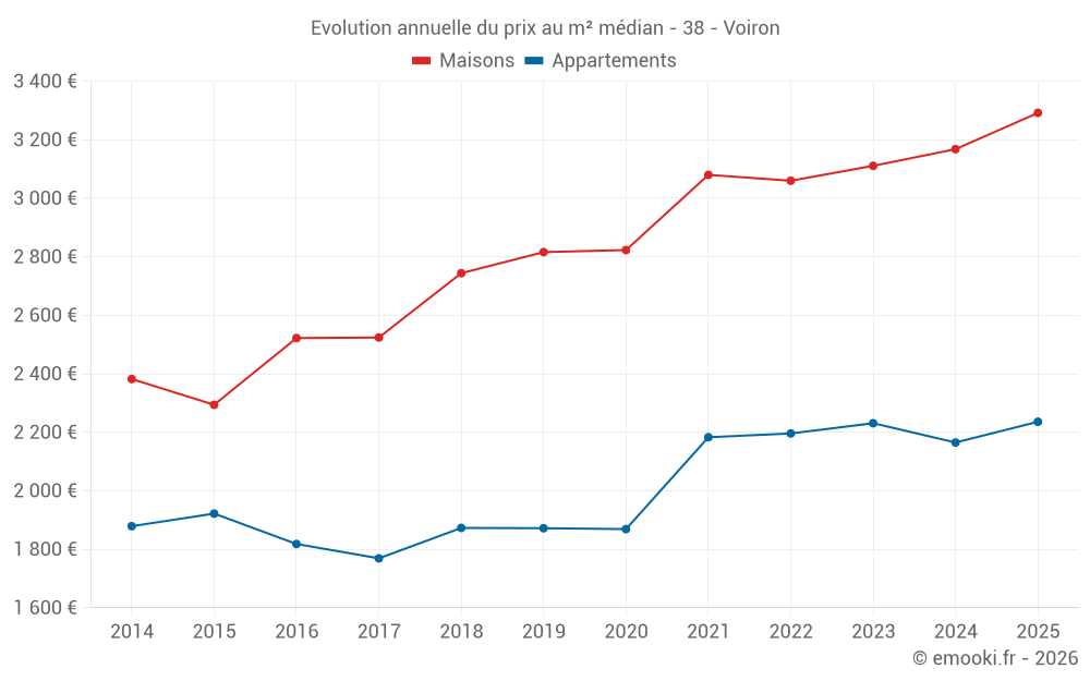 Le prix médian sur les 26 transactions de maisons des 6 derniers mois dans la commune de Voiron était de 3 292 € par mètre carré pour une valeur foncière médiane de 355 525 €. Sur cette période 60% des transactions se sont situées entre 2 768 et 4 005 € par mètre carré (du 2ème au 8ème déciles).