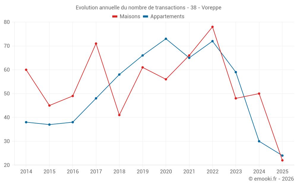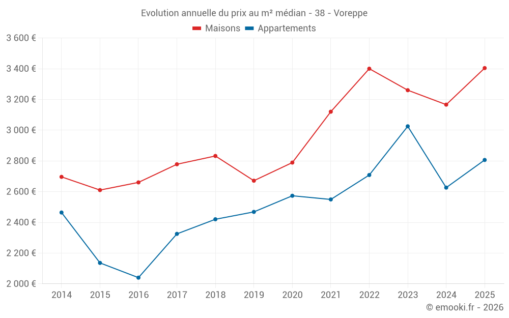Le prix médian sur les 22 transactions de maisons des 6 derniers mois dans la commune de Voreppe était de 3 404 € par mètre carré pour une valeur foncière médiane de 338 760 €. Sur cette période 60% des transactions se sont situées entre 2 705 et 4 192 € par mètre carré (du 2ème au 8ème déciles).