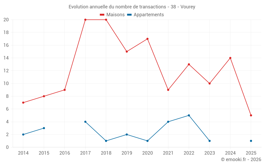 Le prix médian sur les 21 transactions de maisons des 24 derniers mois dans la commune de Vourey était de 2 579 € par mètre carré pour une valeur foncière médiane de 250 000 €. Sur cette période 60% des transactions se sont situées entre 1 755 et 3 218 € par mètre carré (du 2ème au 8ème déciles).