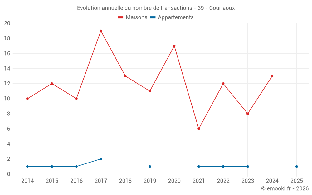 Le prix médian sur les 19 transactions de maisons des 24 derniers mois dans la commune de Courlaoux était de 1 724 € par mètre carré pour une valeur foncière médiane de 175 000 €. Sur cette période 60% des transactions se sont situées entre 1 317 et 2 402 € par mètre carré (du 2ème au 8ème déciles).