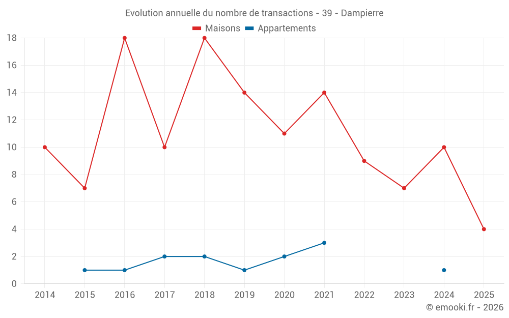 Le prix médian sur les 20 transactions de maisons des 24 derniers mois dans la commune de Dampierre était de 1 778 € par mètre carré pour une valeur foncière médiane de 201 800 €. Sur cette période 60% des transactions se sont situées entre 1 267 et 2 404 € par mètre carré (du 2ème au 8ème déciles).