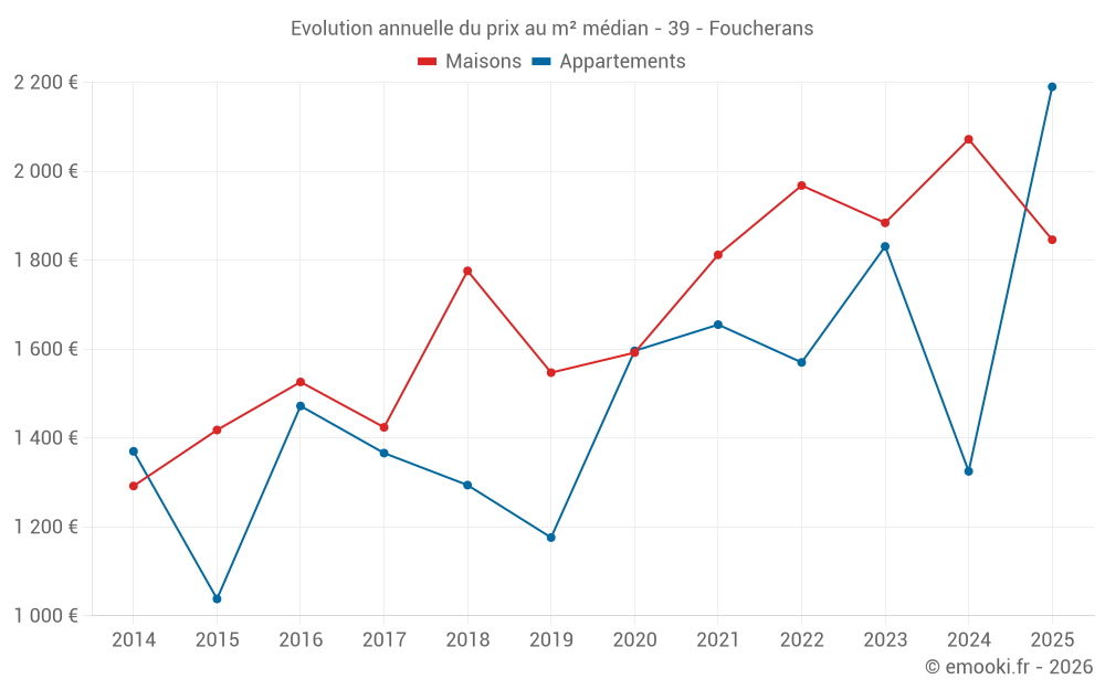 Le prix médian sur les 16 transactions de maisons des 12 derniers mois dans la commune de Foucherans était de 2 033 € par mètre carré pour une valeur foncière médiane de 191 500 €. Sur cette période 60% des transactions se sont situées entre 1 388 et 2 573 € par mètre carré (du 2ème au 8ème déciles).