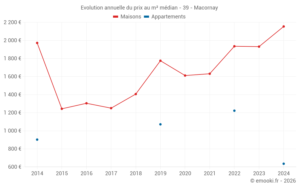 Le prix médian sur les 14 transactions de maisons des 24 derniers mois dans la commune de Macornay était de 2 145 € par mètre carré pour une valeur foncière médiane de 201 930 €. Sur cette période 60% des transactions se sont situées entre 1 754 et 2 352 € par mètre carré (du 2ème au 8ème déciles).
