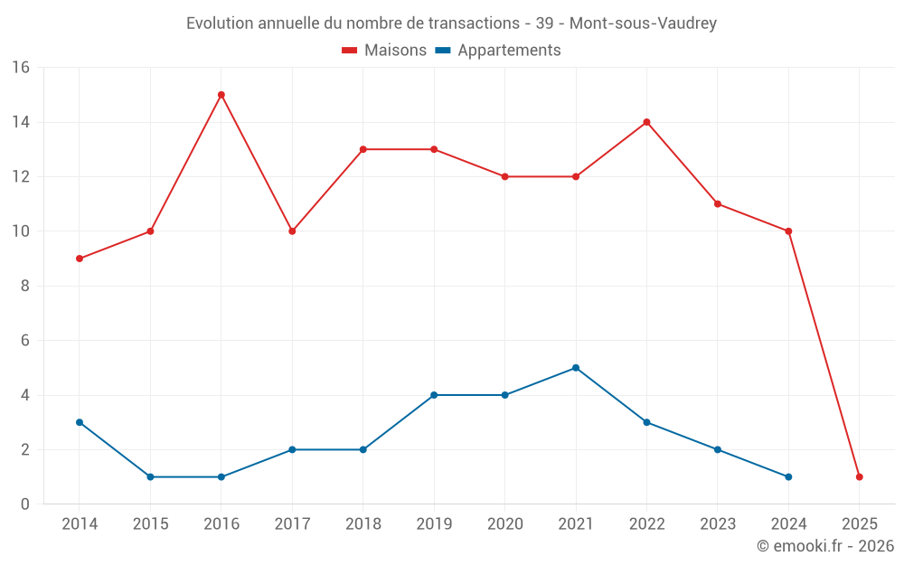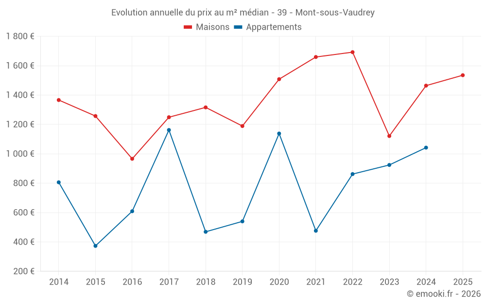 Le prix médian sur les 17 transactions de maisons des 24 derniers mois dans la commune de Mont-sous-Vaudrey était de 1 535 € par mètre carré pour une valeur foncière médiane de 155 000 €. Sur cette période 60% des transactions se sont situées entre 1 175 et 1 983 € par mètre carré (du 2ème au 8ème déciles).