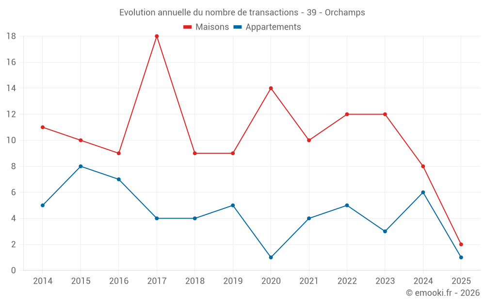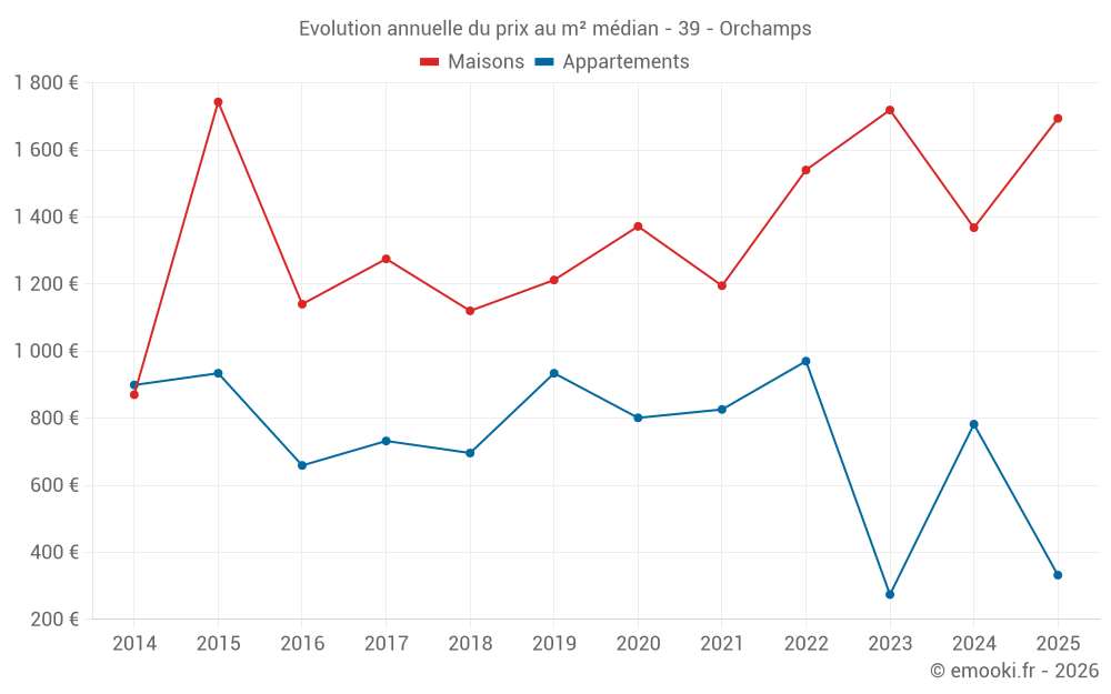 Le prix médian sur les 16 transactions de maisons des 24 derniers mois dans la commune d'Orchamps était de 1 664 € par mètre carré pour une valeur foncière médiane de 144 775 €. Sur cette période 60% des transactions se sont situées entre 938 et 2 274 € par mètre carré (du 2ème au 8ème déciles).