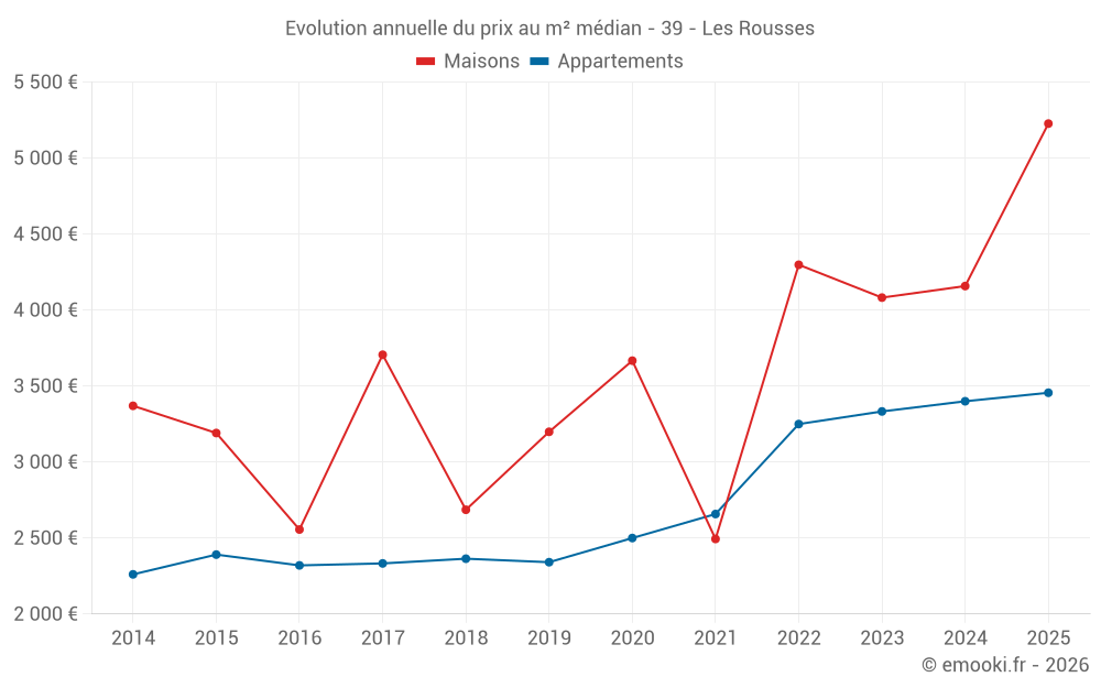 Le prix médian sur les 23 transactions de maisons des 24 derniers mois dans la commune des Rousses était de 4 238 € par mètre carré pour une valeur foncière médiane de 405 500 €. Sur cette période 60% des transactions se sont situées entre 3 061 et 5 288 € par mètre carré (du 2ème au 8ème déciles).