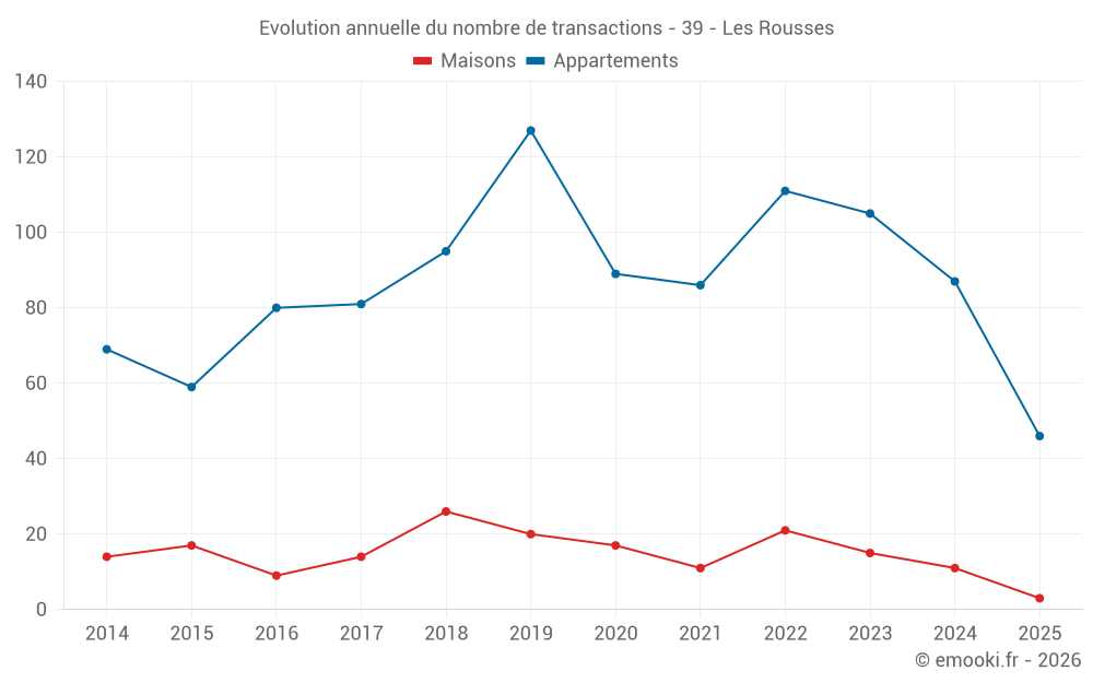 Le prix médian sur les 46 transactions d'appartements des 6 derniers mois dans la commune des Rousses était de 3 456 € par mètre carré pour une valeur foncière médiane de 137 500 €. Sur cette période 60% des transactions se sont situées entre 2 868 et 4 023 € par mètre carré (du 2ème au 8ème déciles).
