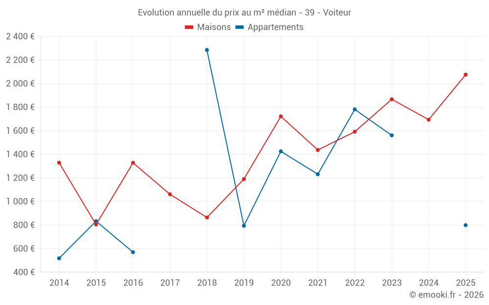 Le prix médian sur les 19 transactions de maisons des 24 derniers mois dans la commune de Voiteur était de 1 867 € par mètre carré pour une valeur foncière médiane de 204 000 €. Sur cette période 60% des transactions se sont situées entre 1 033 et 2 230 € par mètre carré (du 2ème au 8ème déciles).