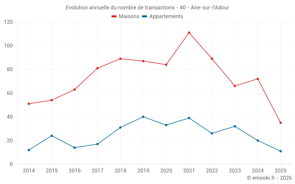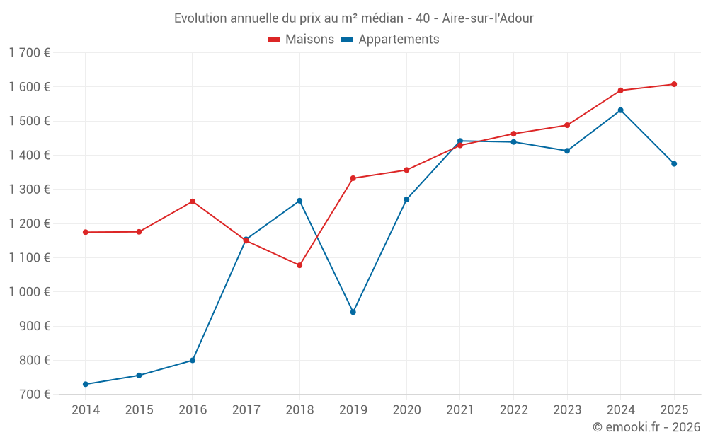 Le prix médian sur les 35 transactions de maisons des 6 derniers mois dans la commune d'Aire-sur-l'Adour était de 1 608 € par mètre carré pour une valeur foncière médiane de 165 000 €. Sur cette période 60% des transactions se sont situées entre 1 000 et 2 077 € par mètre carré (du 2ème au 8ème déciles).