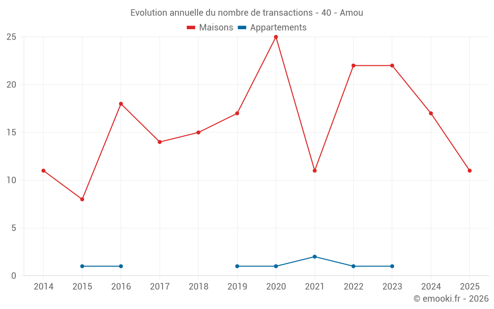 Le prix médian sur les 23 transactions de maisons des 12 derniers mois dans la commune d'Amou était de 1 449 € par mètre carré pour une valeur foncière médiane de 140 500 €. Sur cette période 60% des transactions se sont situées entre 879 et 2 331 € par mètre carré (du 2ème au 8ème déciles).