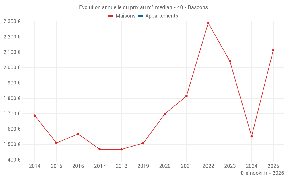 Le prix médian sur les 16 transactions de maisons des 24 derniers mois dans la commune de Bascons était de 1 846 € par mètre carré pour une valeur foncière médiane de 187 500 €. Sur cette période 60% des transactions se sont situées entre 1 294 et 2 475 € par mètre carré (du 2ème au 8ème déciles).