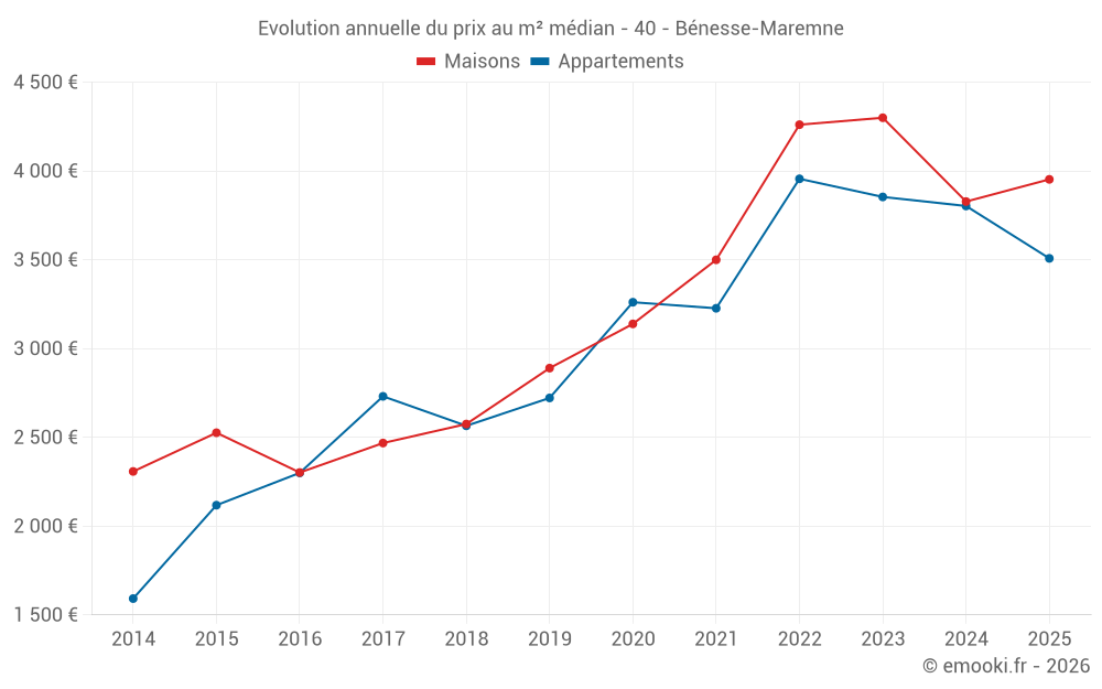 Le prix médian sur les 25 transactions d'appartements des 24 derniers mois dans la commune de Bénesse-Maremne était de 3 682 € par mètre carré pour une valeur foncière médiane de 214 000 €. Sur cette période 60% des transactions se sont situées entre 3 317 et 4 068 € par mètre carré (du 2ème au 8ème déciles).
