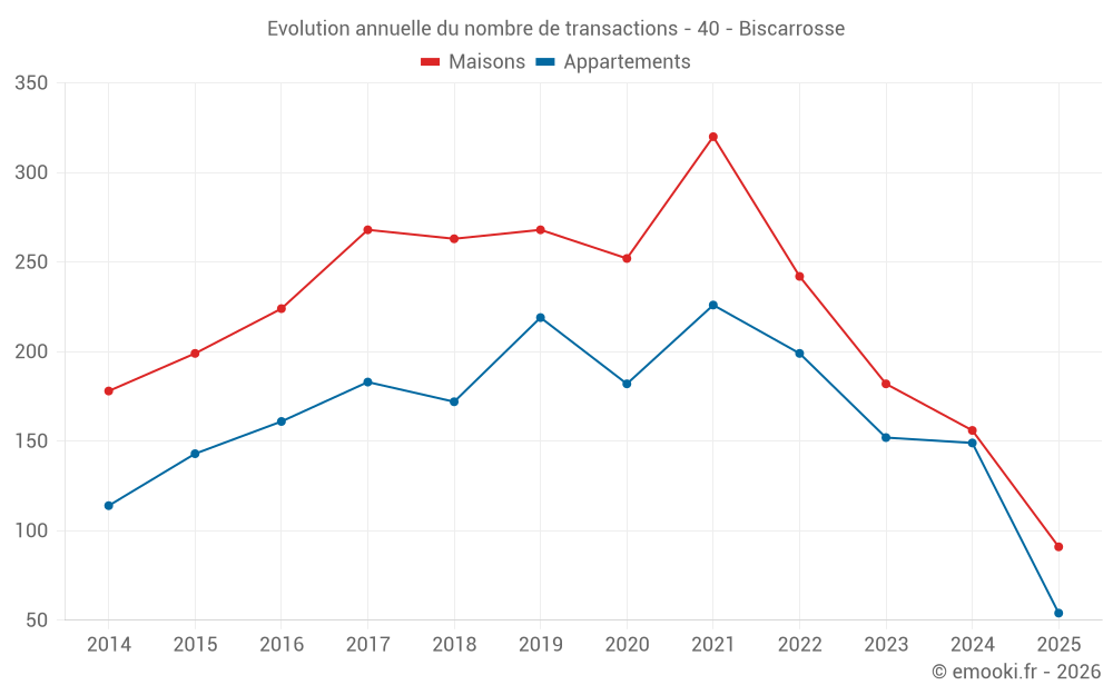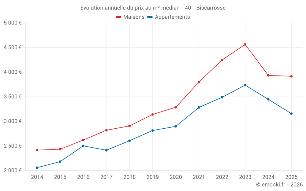 Le prix médian sur les 35 transactions de maisons des 3 derniers mois dans la commune de Biscarrosse était de 3 166 € par mètre carré pour une valeur foncière médiane de 308 000 €. Sur cette période 60% des transactions se sont situées entre 2 196 et 4 506 € par mètre carré (du 2ème au 8ème déciles).