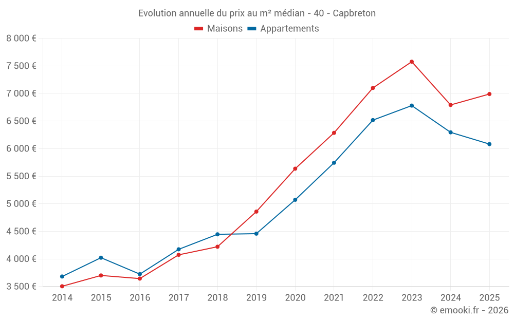 Le prix médian sur les 31 transactions de maisons des 3 derniers mois dans la commune de Capbreton était de 6 941 € par mètre carré pour une valeur foncière médiane de 609 530 €. Sur cette période 60% des transactions se sont situées entre 5 541 et 8 193 € par mètre carré (du 2ème au 8ème déciles).