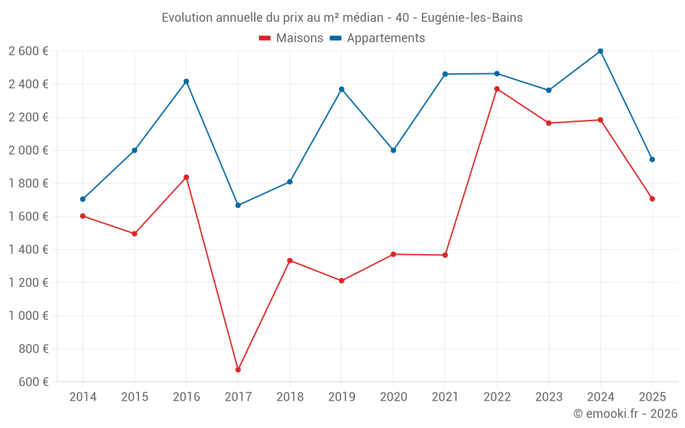 Le prix médian sur les 15 transactions d'appartements des 24 derniers mois dans la commune d'Eugénie-les-Bains était de 2 480 € par mètre carré pour une valeur foncière médiane de 92 500 €. Sur cette période 60% des transactions se sont situées entre 2 222 et 3 055 € par mètre carré (du 2ème au 8ème déciles).