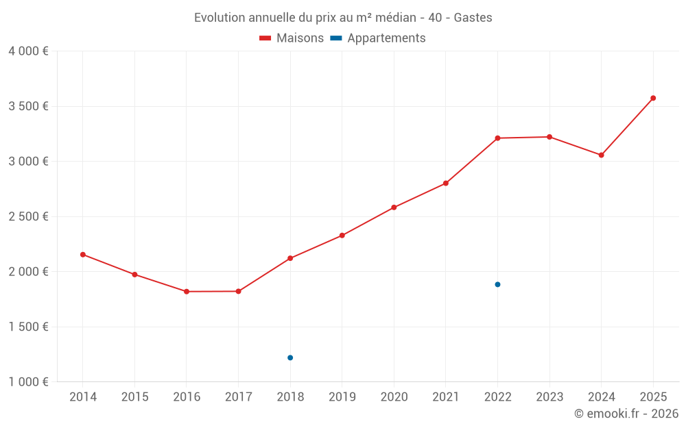 Le prix médian sur les 21 transactions de maisons des 24 derniers mois dans la commune de Gastes était de 3 057 € par mètre carré pour une valeur foncière médiane de 265 955 €. Sur cette période 60% des transactions se sont situées entre 2 726 et 3 814 € par mètre carré (du 2ème au 8ème déciles).