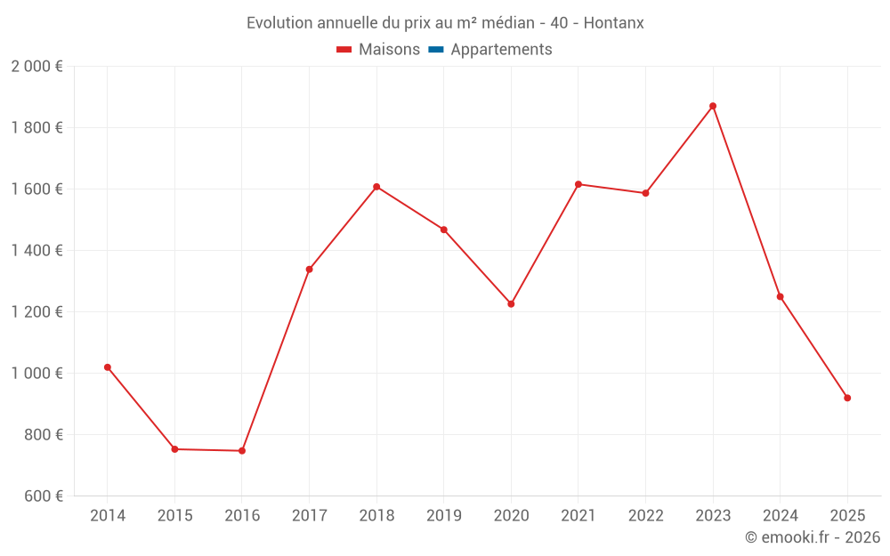 Le prix médian sur les 14 transactions de maisons des 24 derniers mois dans la commune d'Hontanx était de 1 154 € par mètre carré pour une valeur foncière médiane de 133 500 €. Sur cette période 60% des transactions se sont situées entre 837 et 1 870 € par mètre carré (du 2ème au 8ème déciles).