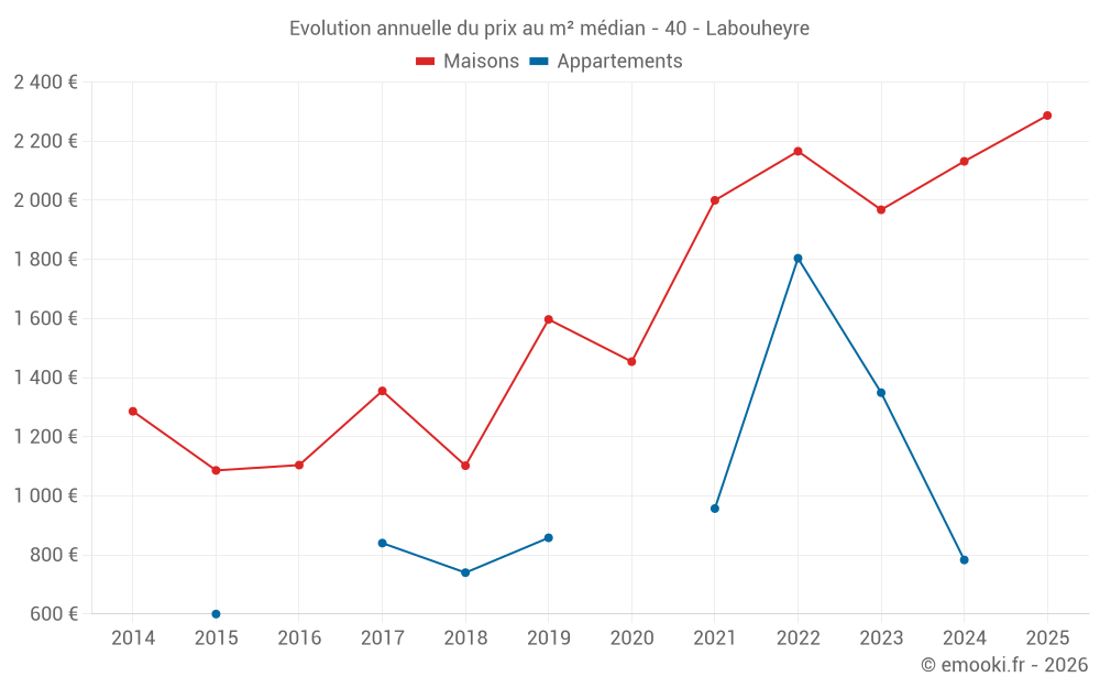 Le prix médian sur les 29 transactions de maisons des 12 derniers mois dans la commune de Labouheyre était de 2 222 € par mètre carré pour une valeur foncière médiane de 199 900 €. Sur cette période 60% des transactions se sont situées entre 1 459 et 2 626 € par mètre carré (du 2ème au 8ème déciles).