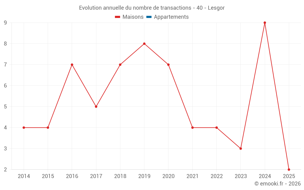 Le prix médian sur les 14 transactions de maisons des 24 derniers mois dans la commune de Lesgor était de 1 718 € par mètre carré pour une valeur foncière médiane de 189 000 €. Sur cette période 60% des transactions se sont situées entre 1 378 et 2 162 € par mètre carré (du 2ème au 8ème déciles).