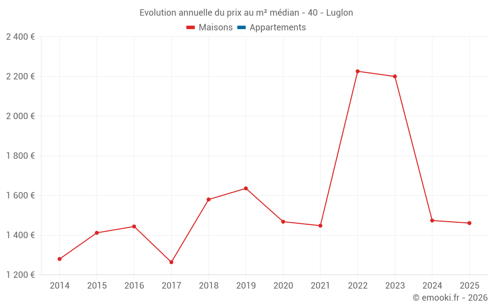 Le prix médian sur les 15 transactions de maisons des 24 derniers mois dans la commune de Luglon était de 1 872 € par mètre carré pour une valeur foncière médiane de 170 209 €. Sur cette période 60% des transactions se sont situées entre 962 et 2 209 € par mètre carré (du 2ème au 8ème déciles).