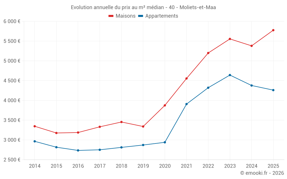 Le prix médian sur les 26 transactions d'appartements des 6 derniers mois dans la commune de Moliets-et-Maa était de 4 261 € par mètre carré pour une valeur foncière médiane de 127 225 €. Sur cette période 60% des transactions se sont situées entre 3 492 et 5 404 € par mètre carré (du 2ème au 8ème déciles).