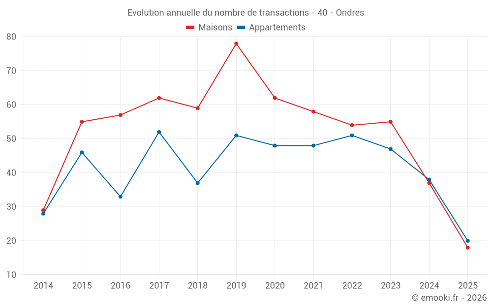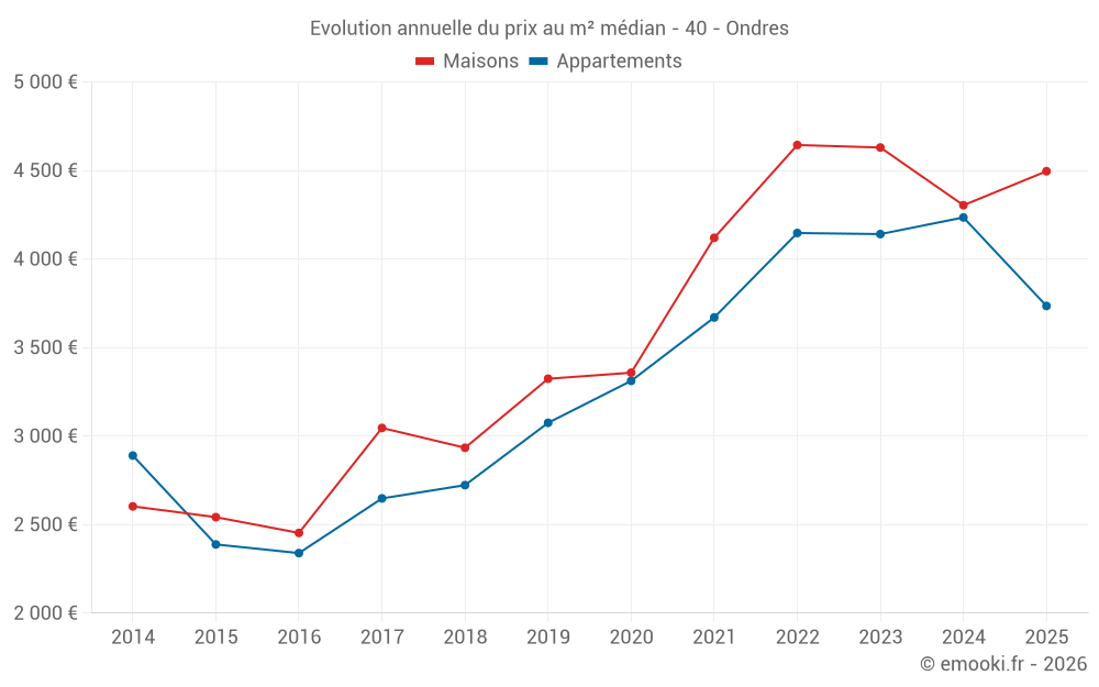 Le prix médian sur les 18 transactions de maisons des 6 derniers mois dans la commune d'Ondres était de 4 496 € par mètre carré pour une valeur foncière médiane de 460 500 €. Sur cette période 60% des transactions se sont situées entre 3 850 et 4 810 € par mètre carré (du 2ème au 8ème déciles).