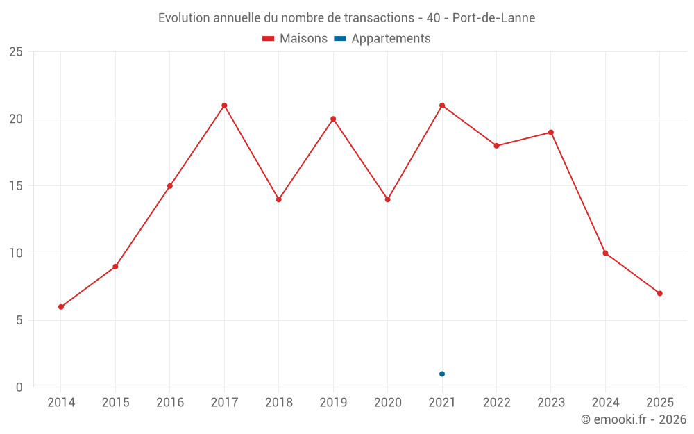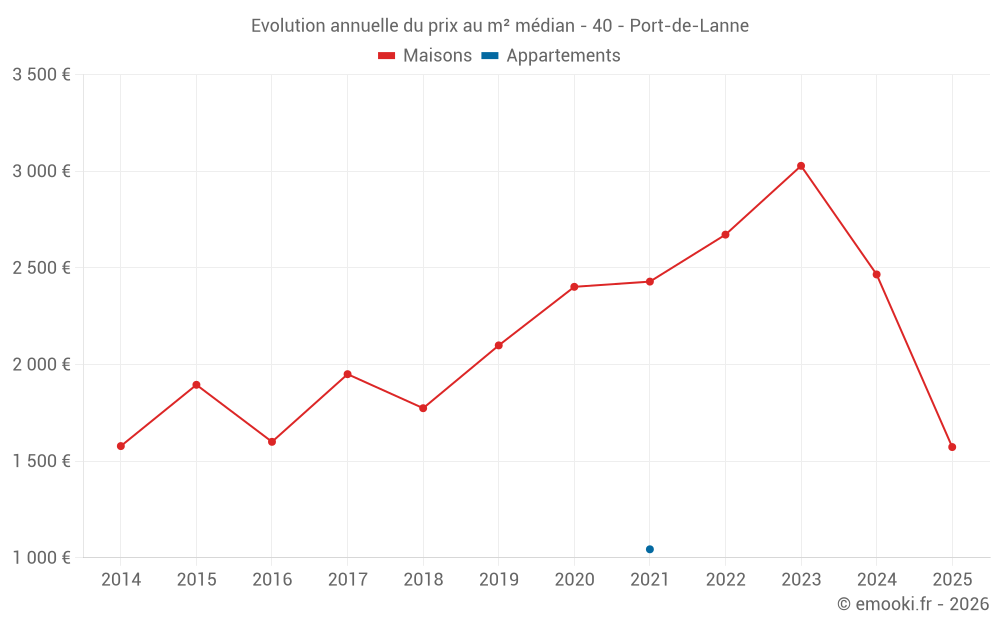 Le prix médian sur les 29 transactions de maisons des 24 derniers mois dans la commune de Port-de-Lanne était de 2 675 € par mètre carré pour une valeur foncière médiane de 262 000 €. Sur cette période 60% des transactions se sont situées entre 1 565 et 3 359 € par mètre carré (du 2ème au 8ème déciles).