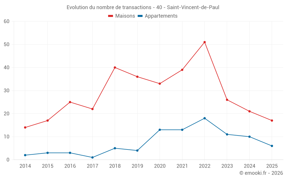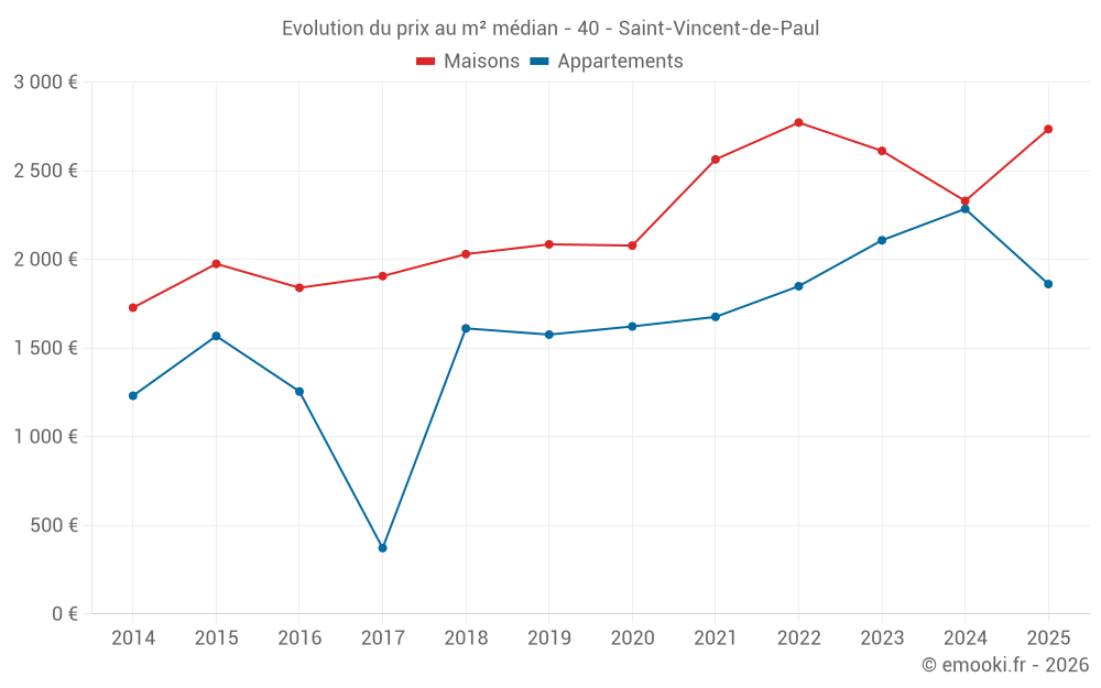 Le prix médian sur les 28 transactions de maisons des 12 derniers mois dans la commune de Saint-Vincent-de-Paul était de 2 754 € par mètre carré pour une valeur foncière médiane de 230 595 €. Sur cette période 60% des transactions se sont situées entre 2 175 et 3 324 € par mètre carré (du 2ème au 8ème déciles).