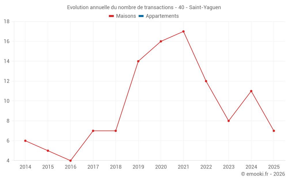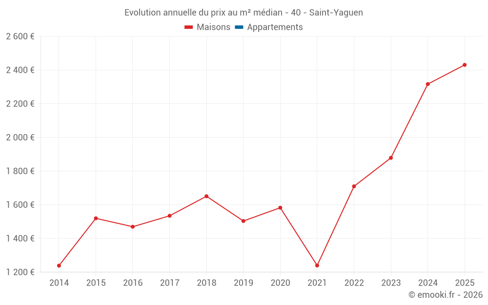 Le prix médian sur les 23 transactions de maisons des 24 derniers mois dans la commune de Saint-Yaguen était de 2 188 € par mètre carré pour une valeur foncière médiane de 234 649 €. Sur cette période 60% des transactions se sont situées entre 1 500 et 2 454 € par mètre carré (du 2ème au 8ème déciles).