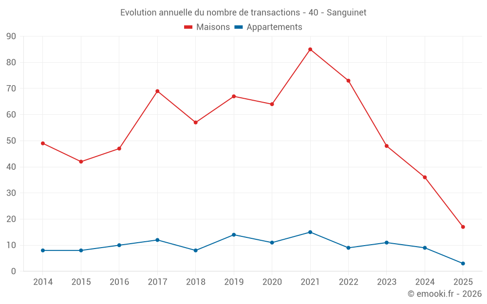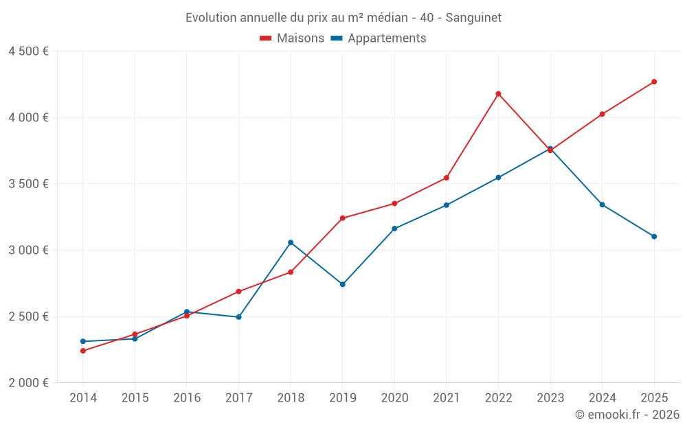 Le prix médian sur les 44 transactions de maisons des 12 derniers mois dans la commune de Sanguinet était de 4 026 € par mètre carré pour une valeur foncière médiane de 354 500 €. Sur cette période 60% des transactions se sont situées entre 3 040 et 4 828 € par mètre carré (du 2ème au 8ème déciles).