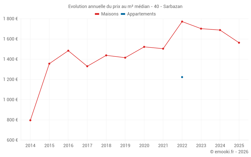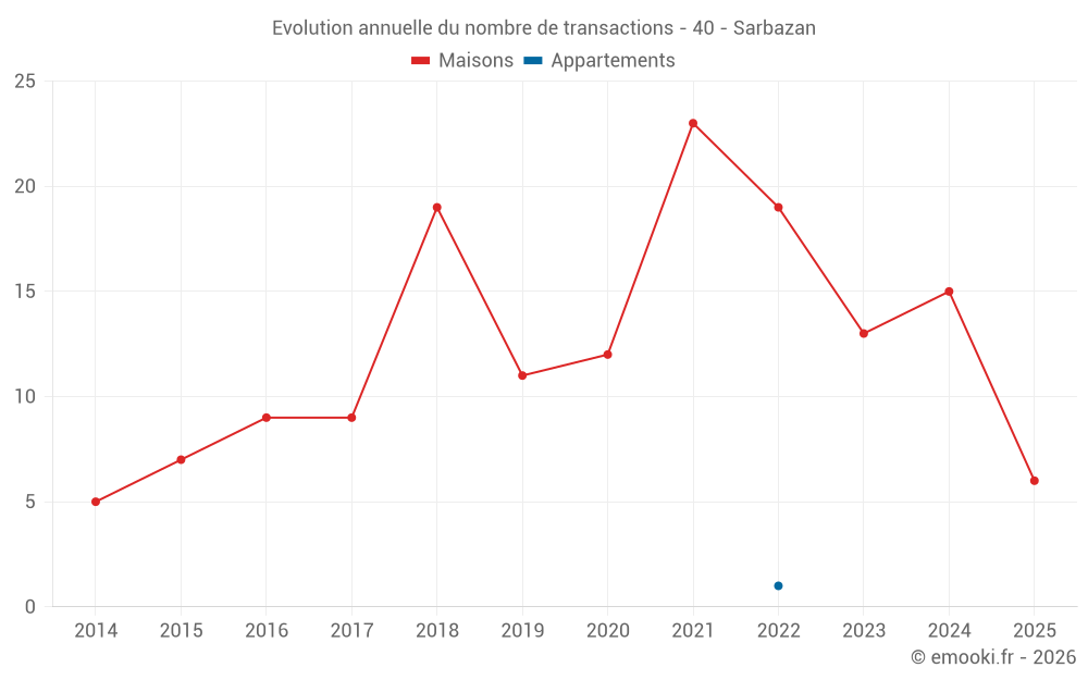 Le prix médian sur les 30 transactions de maisons des 24 derniers mois dans la commune de Sarbazan était de 1 692 € par mètre carré pour une valeur foncière médiane de 151 000 €. Sur cette période 60% des transactions se sont situées entre 1 390 et 1 866 € par mètre carré (du 2ème au 8ème déciles).