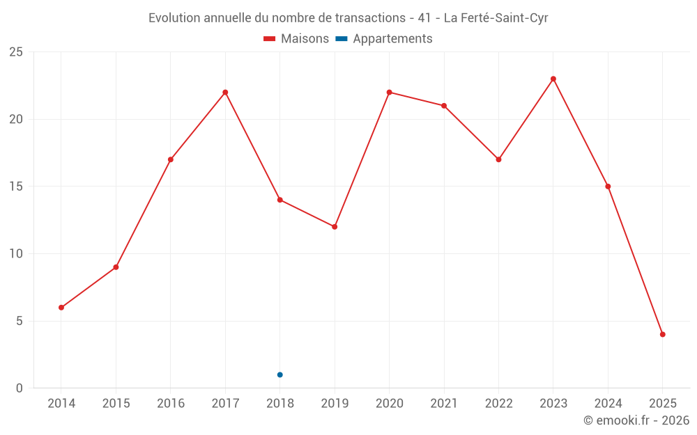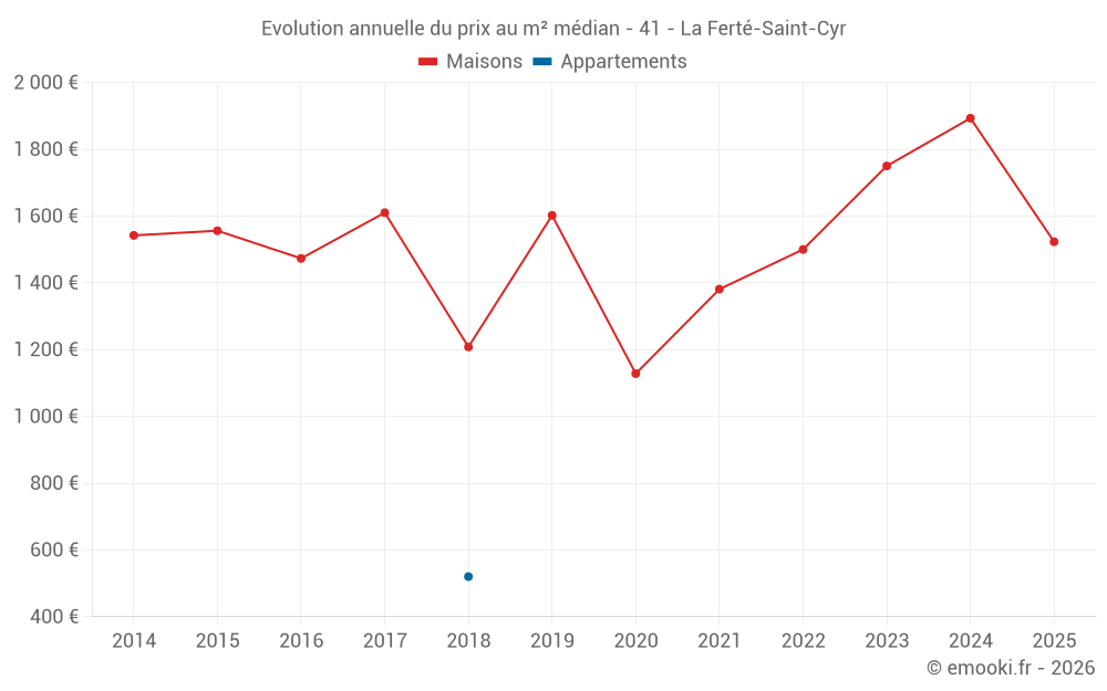 Le prix médian sur les 31 transactions de maisons des 24 derniers mois dans la commune de la Ferté-Saint-Cyr était de 1 750 € par mètre carré pour une valeur foncière médiane de 150 000 €. Sur cette période 60% des transactions se sont situées entre 1 128 et 2 075 € par mètre carré (du 2ème au 8ème déciles).