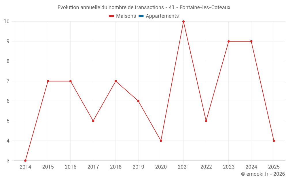 Le prix médian sur les 18 transactions de maisons des 24 derniers mois dans la commune de Fontaine-les-Coteaux était de 1 314 € par mètre carré pour une valeur foncière médiane de 111 000 €. Sur cette période 60% des transactions se sont situées entre 948 et 1 900 € par mètre carré (du 2ème au 8ème déciles).