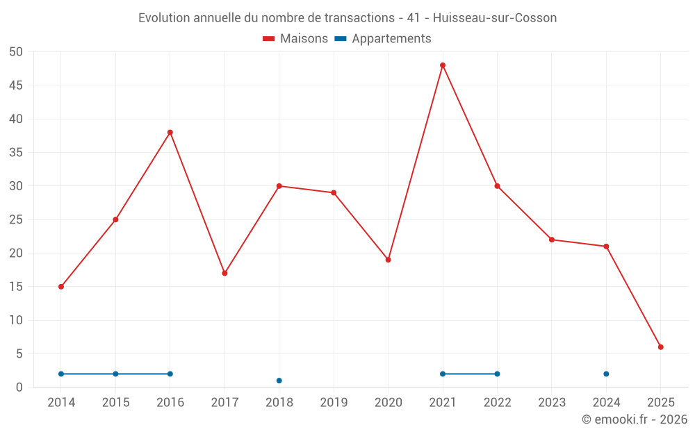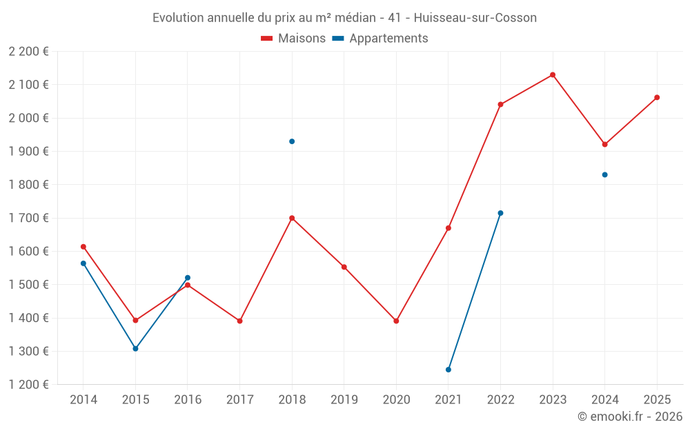 Le prix médian sur les 34 transactions de maisons des 24 derniers mois dans la commune d'Huisseau-sur-Cosson était de 1 976 € par mètre carré pour une valeur foncière médiane de 206 000 €. Sur cette période 60% des transactions se sont situées entre 1 561 et 2 373 € par mètre carré (du 2ème au 8ème déciles).